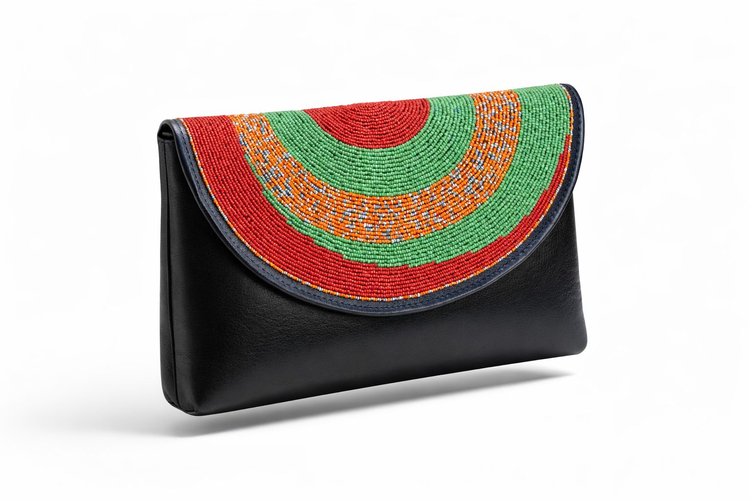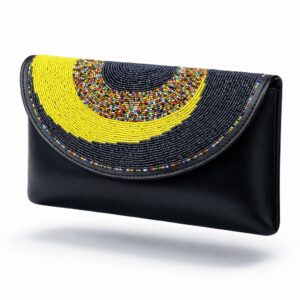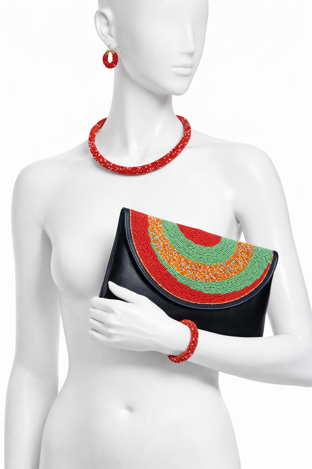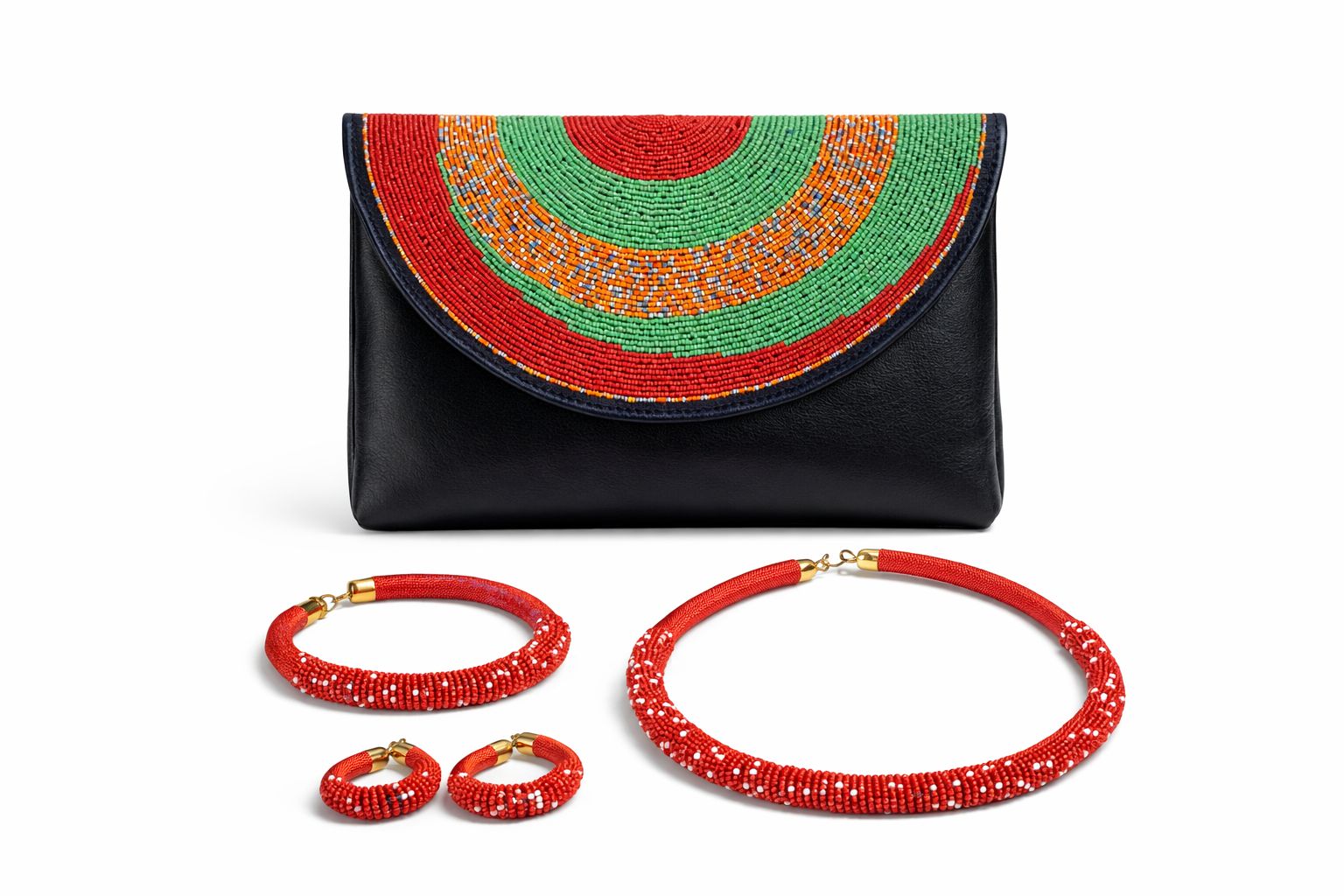 The clutch showcases intricate concentric beadwork in rich red, green and golden tones over smooth black leather, creating a striking cultural statement. The coordinating necklace, earrings and bracelet are carefully wrapped and hand beaded to complement the bag, forming a complete polished look.