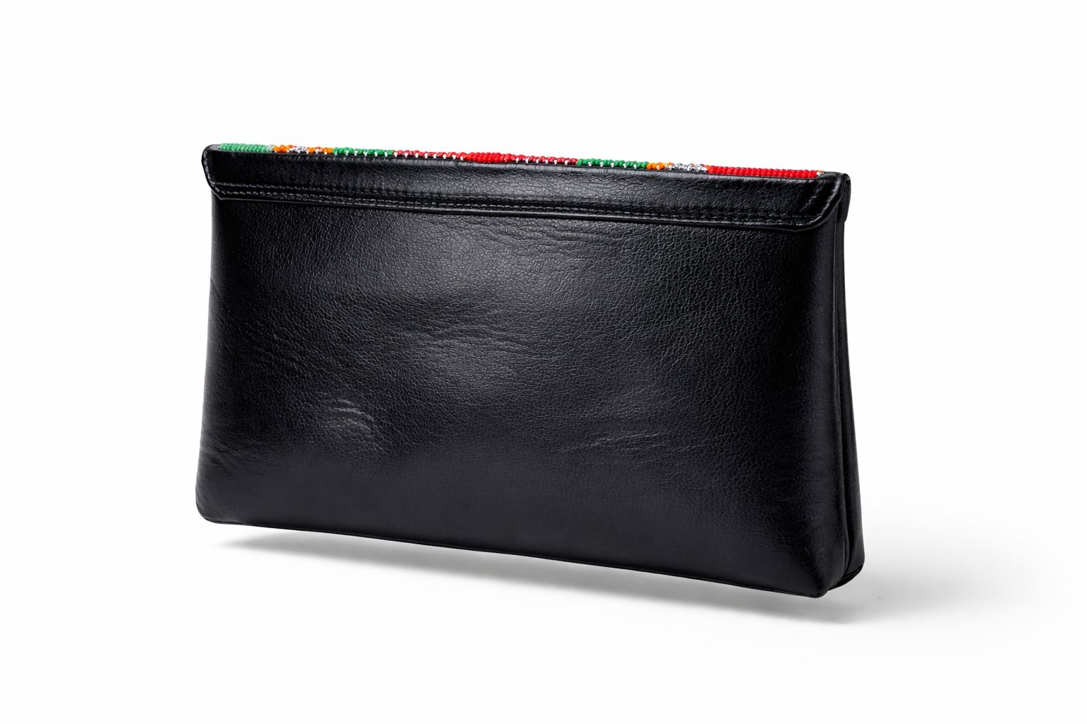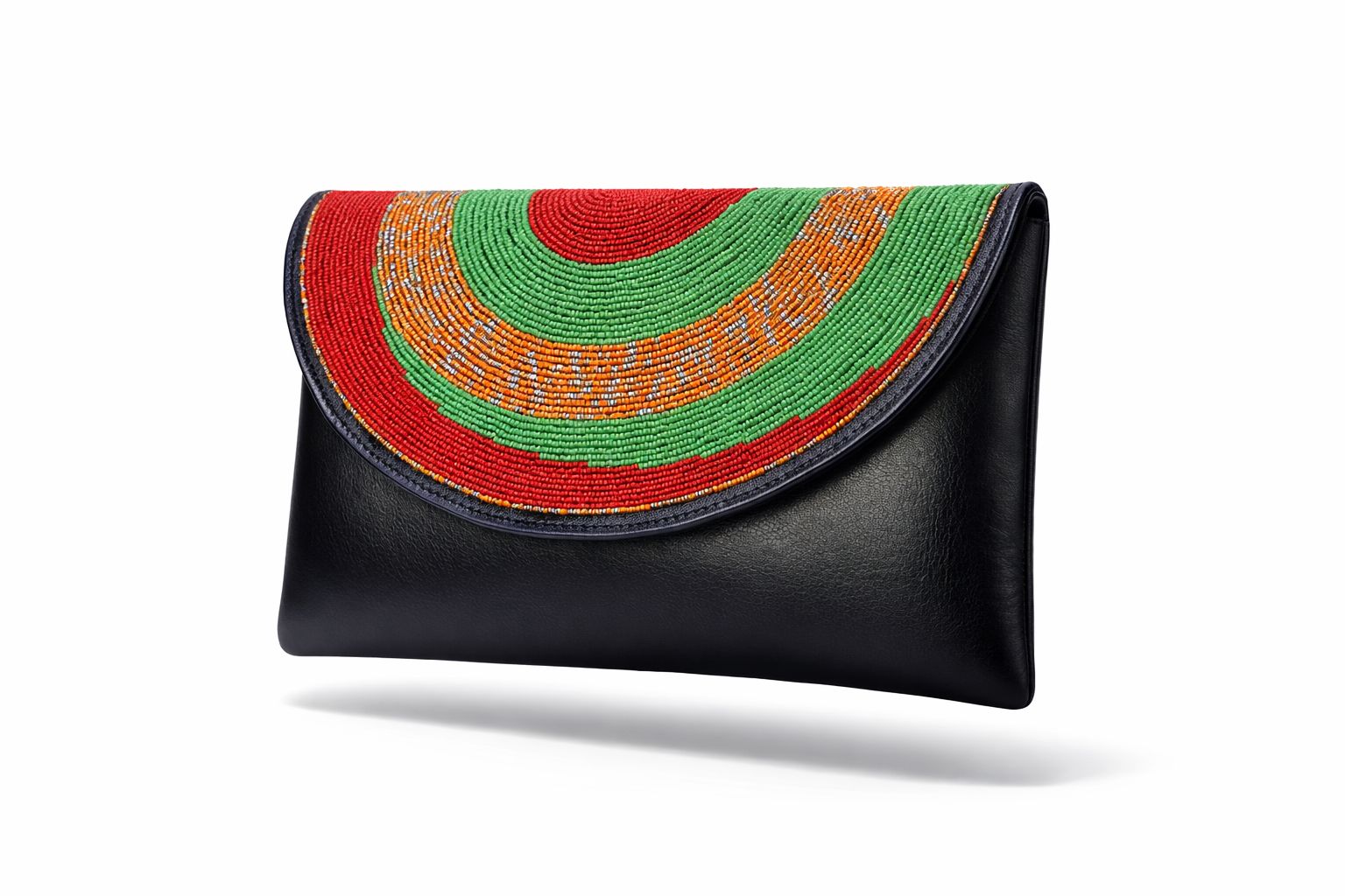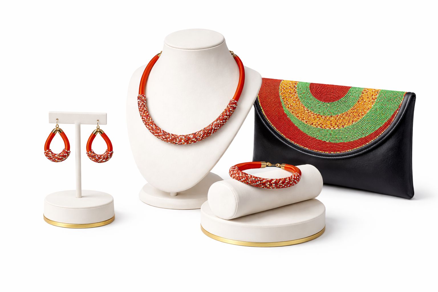 The clutch showcases intricate concentric beadwork in rich red, green and golden tones over smooth black leather, creating a striking cultural statement. The coordinating necklace, earrings and bracelet are carefully wrapped and hand beaded to complement the bag, forming a complete polished look.